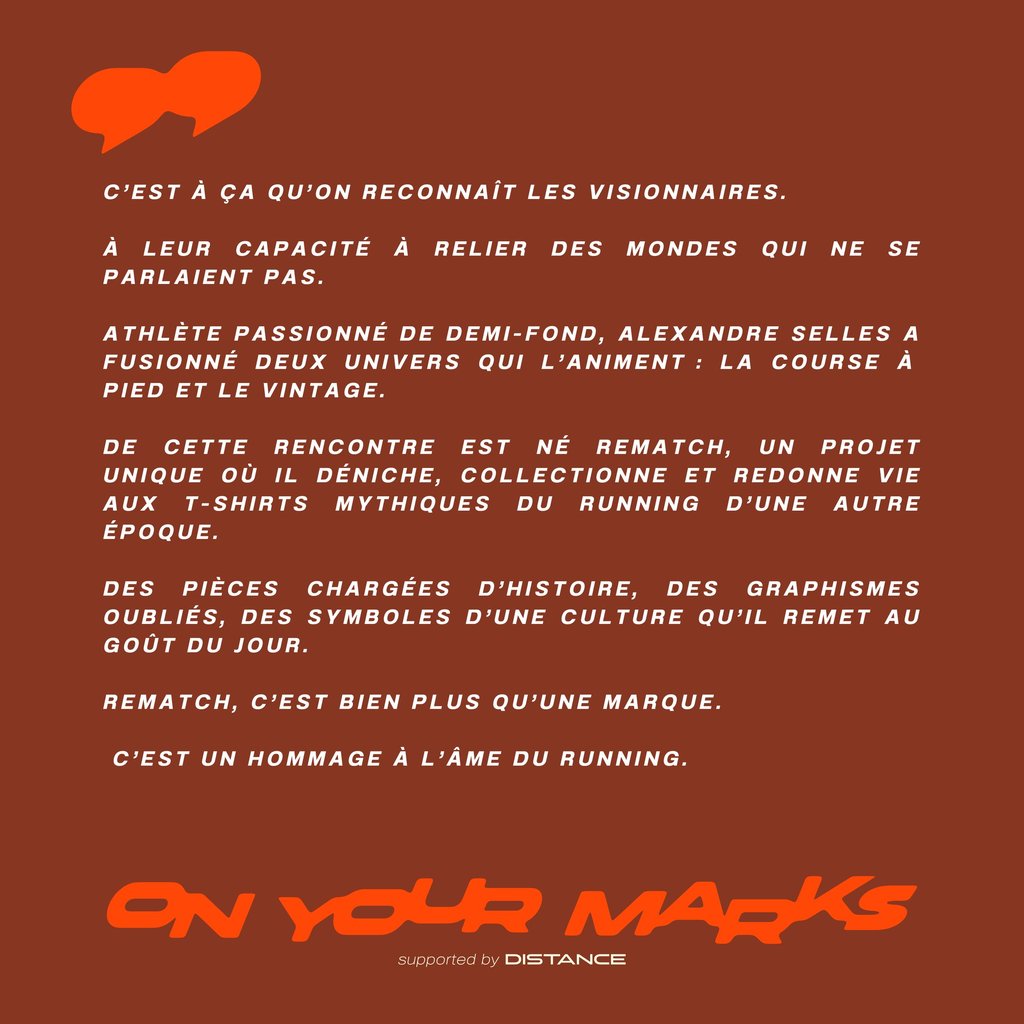 Plongez dans l’univers d’Alexandre Selles, athlète de haut niveau et fondateur de Rematch, un projet unique qui relie la culture running et la mode vintage. Dans cet épisode d’On Your Marks, découvrez comment Alexandre chine, collectionne et redonne vie aux t-shirts emblématiques de la course à pied d’une autre époque. Un échange inspirant sur la passion du running, la créativité et la mémoire du sport, à écouter pour tous les amoureux de course, de style et d’histoire.