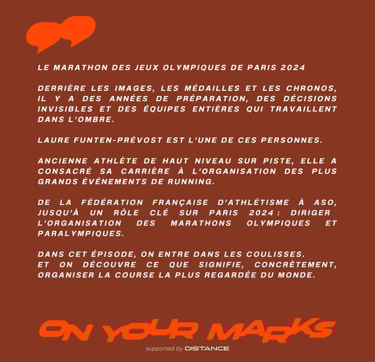 Comment organise-t-on le marathon des Jeux Olympiques de Paris 2024 ? Dans cet épisode d’On Your Marks, Laure Funten Prévot — ancienne athlète de haut niveau et responsable des marathons olympiques et paralympiques — nous emmène dans les coulisses de l’événement running le plus regardé au monde. Organisation, contraintes, parcours, pression et décisions clés : un épisode immersif au cœur du marathon olympique.