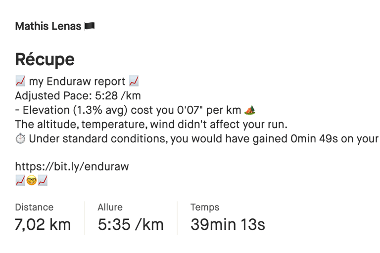 Rien de plus simple et en plus c’est gratuit ! Il suffit d’aller sur le site internet d’Enduraw (https://www.joseph-mestrallet.com/strava-integration) et de créer un compte en suivant les étapes indiquées. Ensuite, Enduraw vous demandera la permission de collecter les données liées à vos activités Strava. Une fois la connexion effectuée, rien d’autre à faire à part aller courir 🏃🏼♂️ Sur votre prochaine sortie, vous retrouverez dans la description de votre activité le rapport d’analyse d’Enduraw. Vous pourrez bien évidemment supprimer ce rapport si vous le désirez.