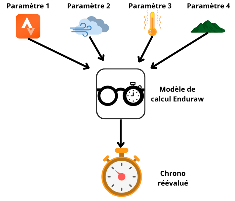 Aujourd’hui, il est très difficile pour les sportifs amateurs de mesurer l’impact de ces paramètres sur la performance. C’est pour tenter de résoudre ce problème qu’Enduraw a développé son intégration ! Lorsque vous courez et que vous mettez votre activité sur Strava, Enduraw va récupérer ces données et les entrer dans son modèle de calcul. Mais Enduraw va aussi aller chercher d’autres données comme la météo, le vent, l’altitude sur votre parcours sur d’autres bases de données. Une fois les données récoltées, l’intégration les entre dans le modèle de prédictions utilisé par Joseph et Alodie. Le modèle de prédiction est comme une grande calculette qui prend des valeurs en entrée (votre activité, la météo, la température etc.), qui fait un calcul complexe basé sur des résultats scientifiques, et qui sort en résultats un chronomètre ajusté si vous aviez réalisé votre activité dans des conditions standards.