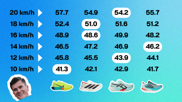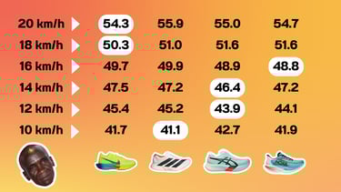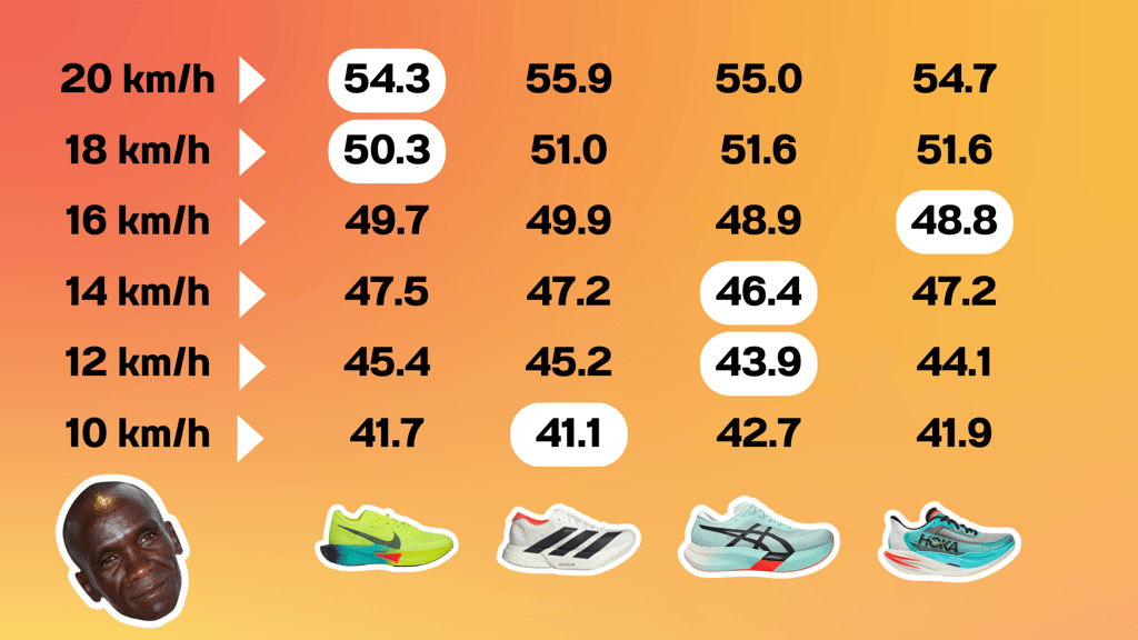 Par exemple, si un coureur utilise 50 ml d’oxygène par minute par kg de poids corporel à 16 km/h avec une chaussure A, et seulement 48 ml avec une chaussure B, alors la chaussure B est plus efficace. C’est cette métrique qui est utilisée par les marques pour affirmer que leurs chaussures « font courir plus vite ».