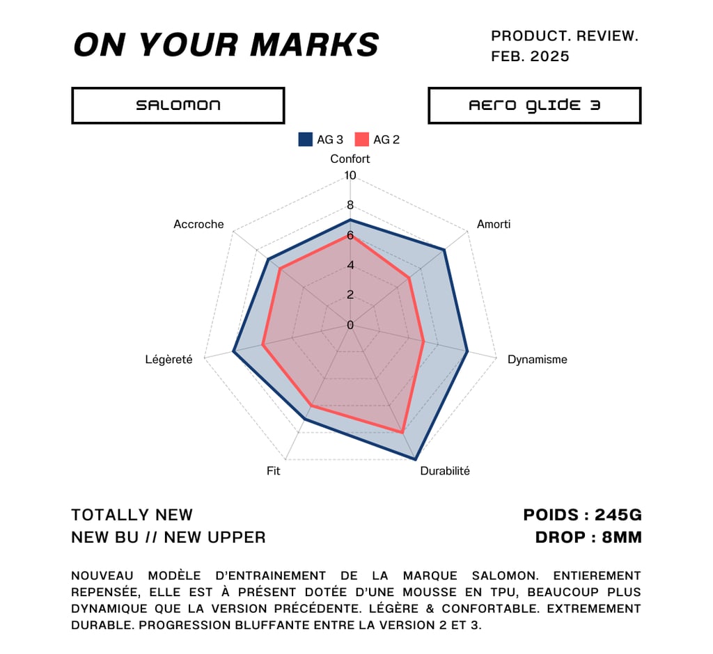 Nous avions déjà testé les Aero Glide 1 et Aero Glide 2, mais aucun des deux modèles ne nous avait vraiment convaincus. Alors, lorsque nous avons reçu la version 3, nous avons été surpris de constater autant de changements : nouvelle mousse, nouveau look, nouvelles lignes. Nous avions hâte de l’essayer !